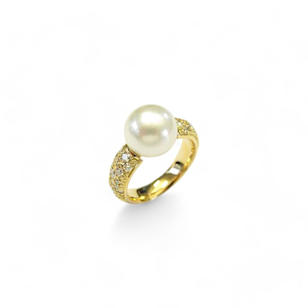 Bague en or jaune 18ct, 18 diamants taille brillant 0.324ct W-vs, 1 perle des Mers du Sud, blanche, ronde/semi-ronde 10-10.5mm